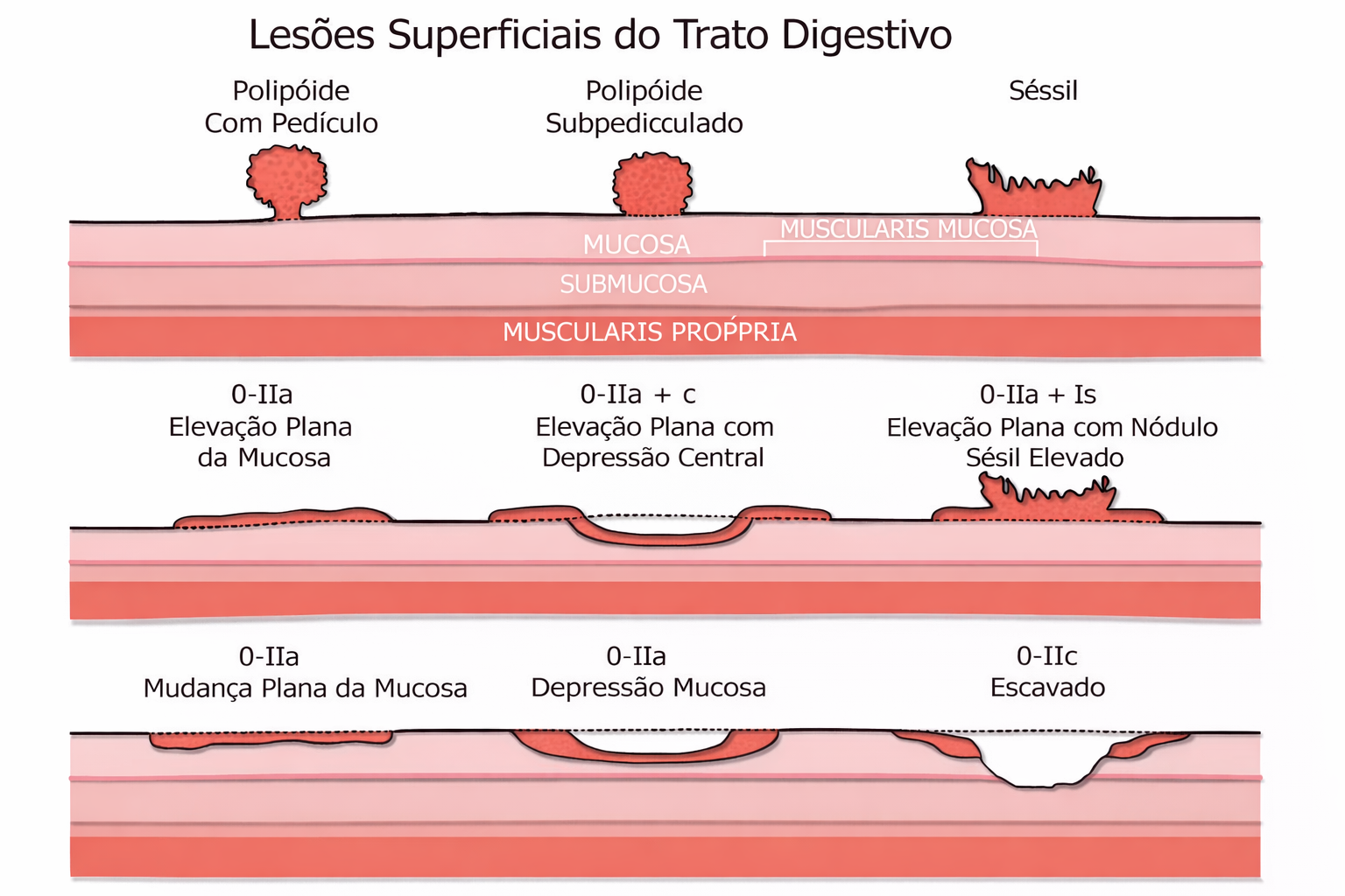 Classificação de Paris — esquema histológico das lesões superficiais do trato digestivo: polipóide com pedículo, subpediculado e séssil (0-I); elevação plana, com depressão central e com nódulo séssil (0-IIa); mudança plana, depressão mucosa e escavado (0-IIc)